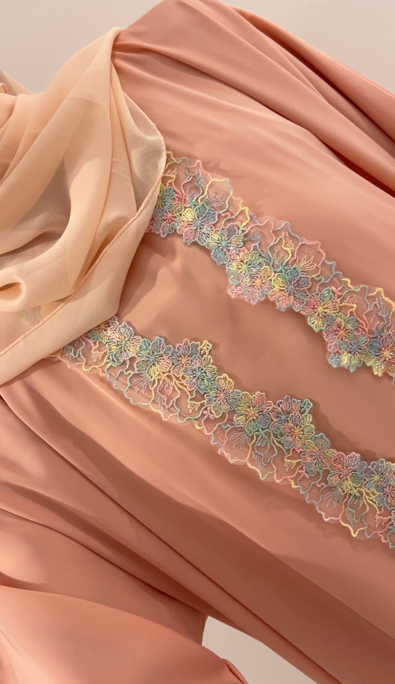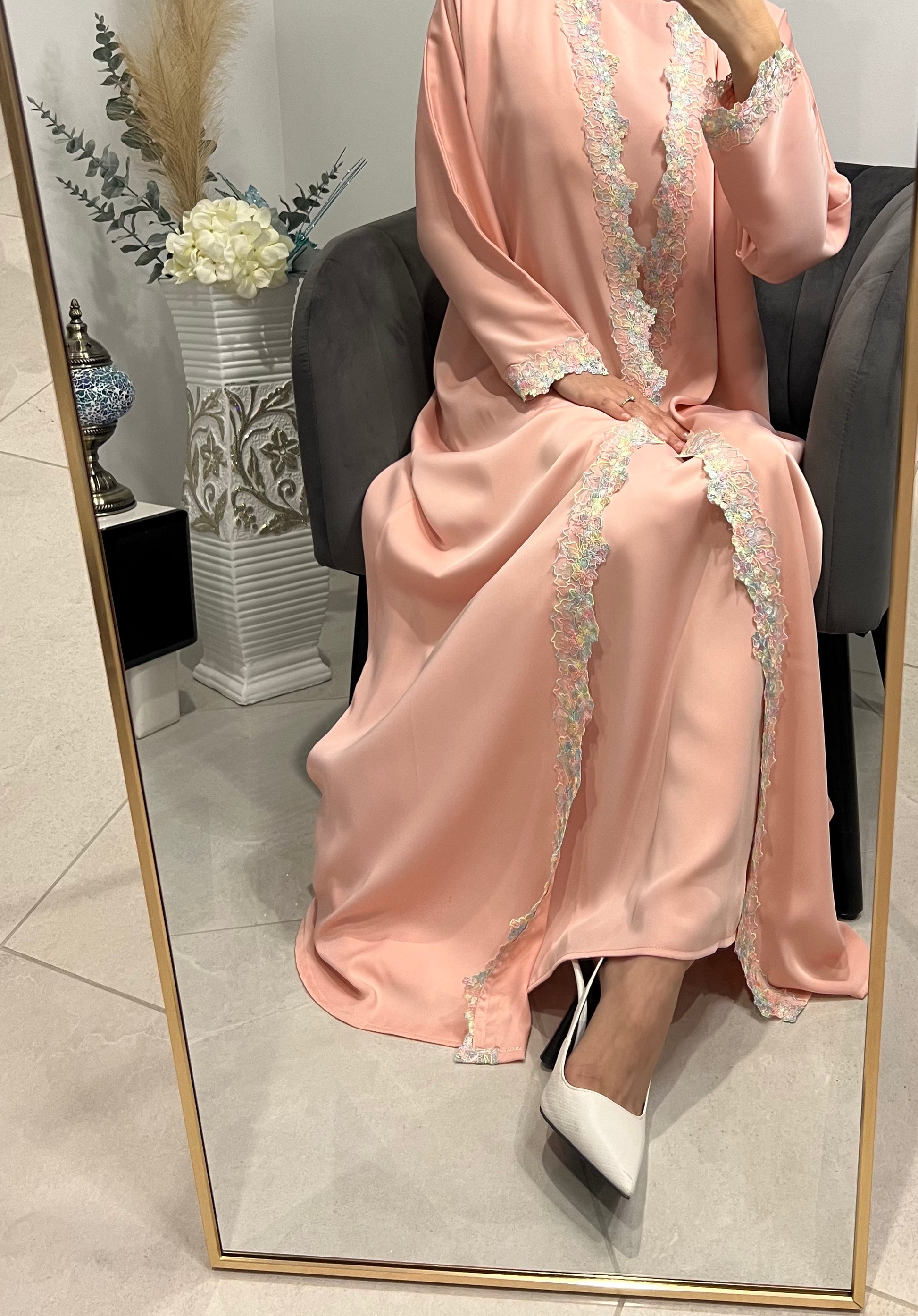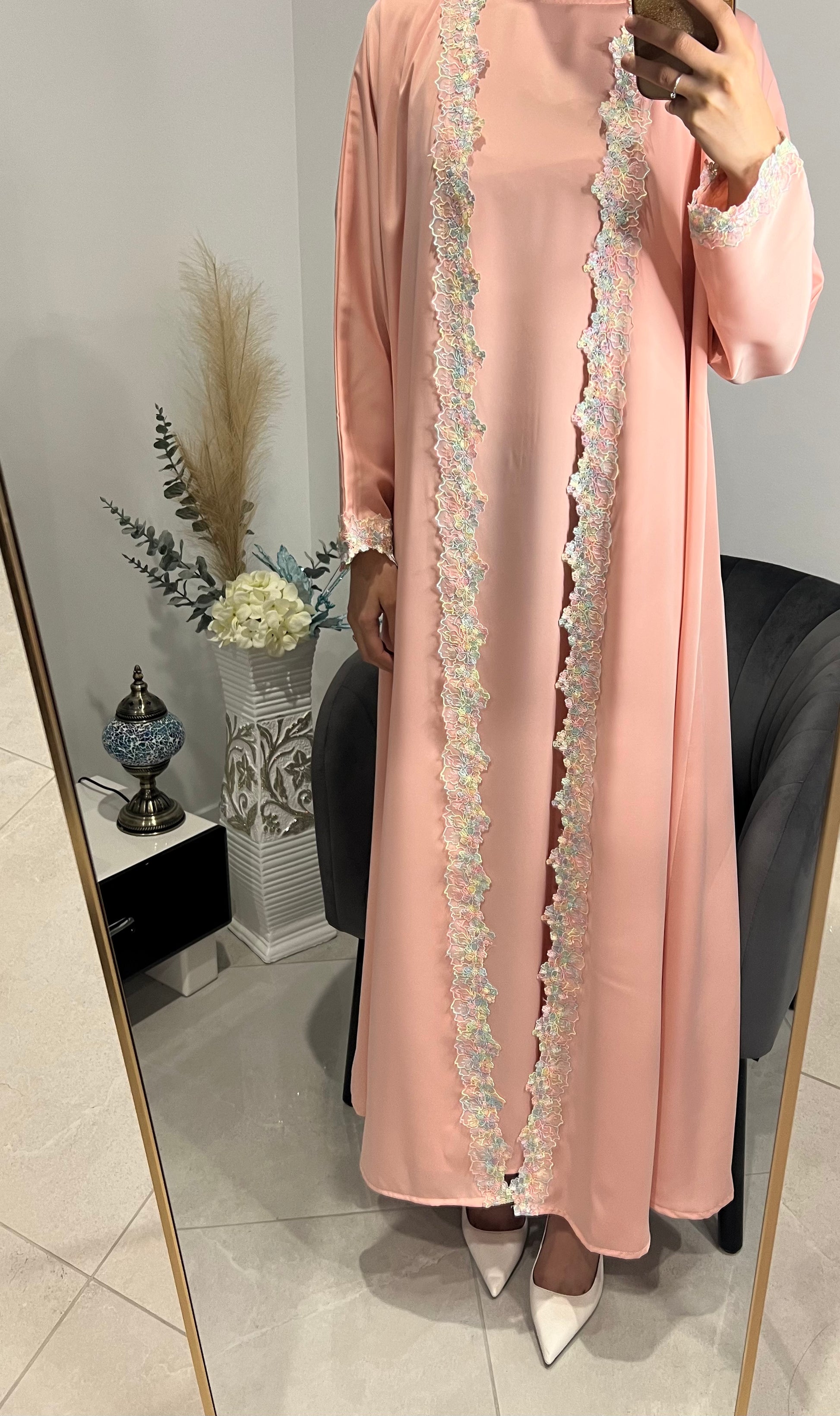 Abaya is a breathable material with lace design. Abaya is perfect for picnics for an aesthetic vibe. It will come as a 3 piece set, open abaya with matching under dress and free matching hijab.